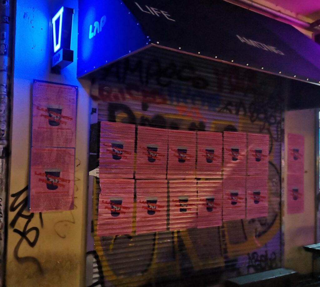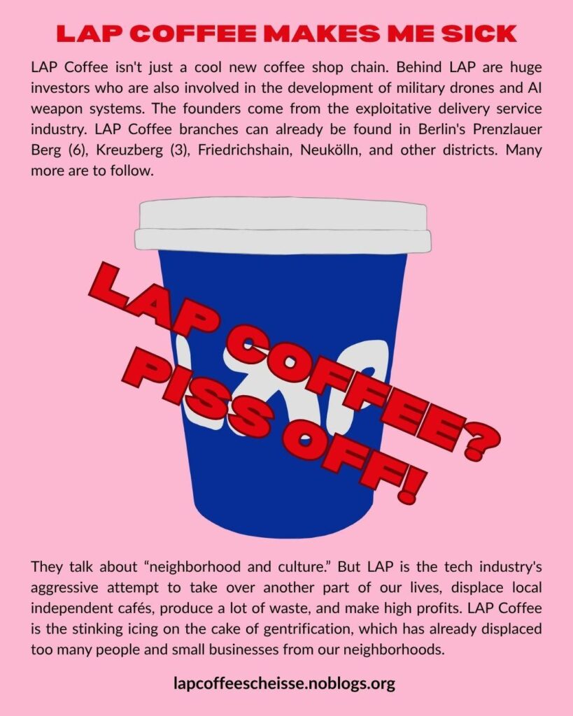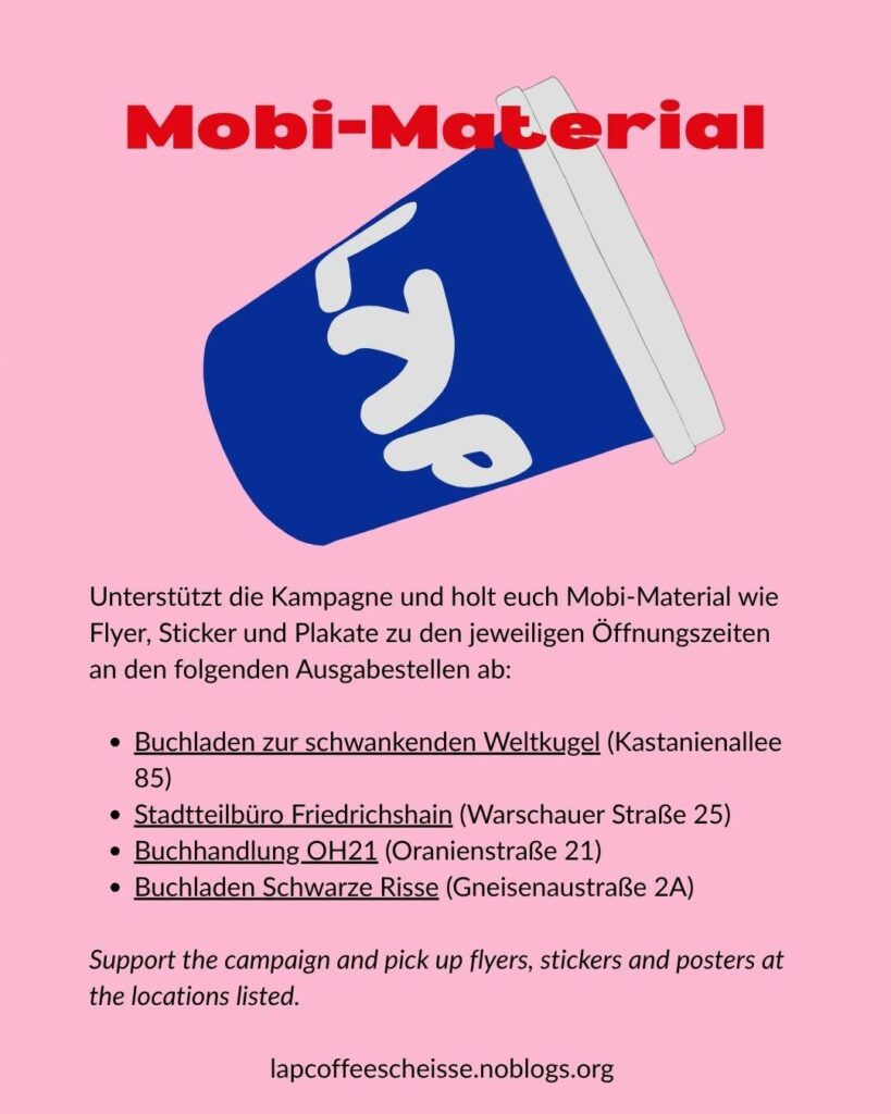Mittlerweile gibt es Flyer, Sticker und Plakate in deutsch und englisch an verschiedenen Orten zum Abholen (siehe unten). Erste Lap Coffee Läden wurden bereits umdekoriert. Es gibt viel was getan werden kann – wir freuen uns über Infos & Bilder!