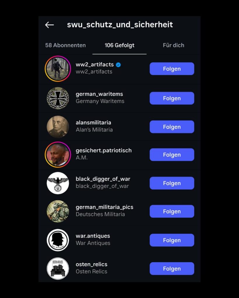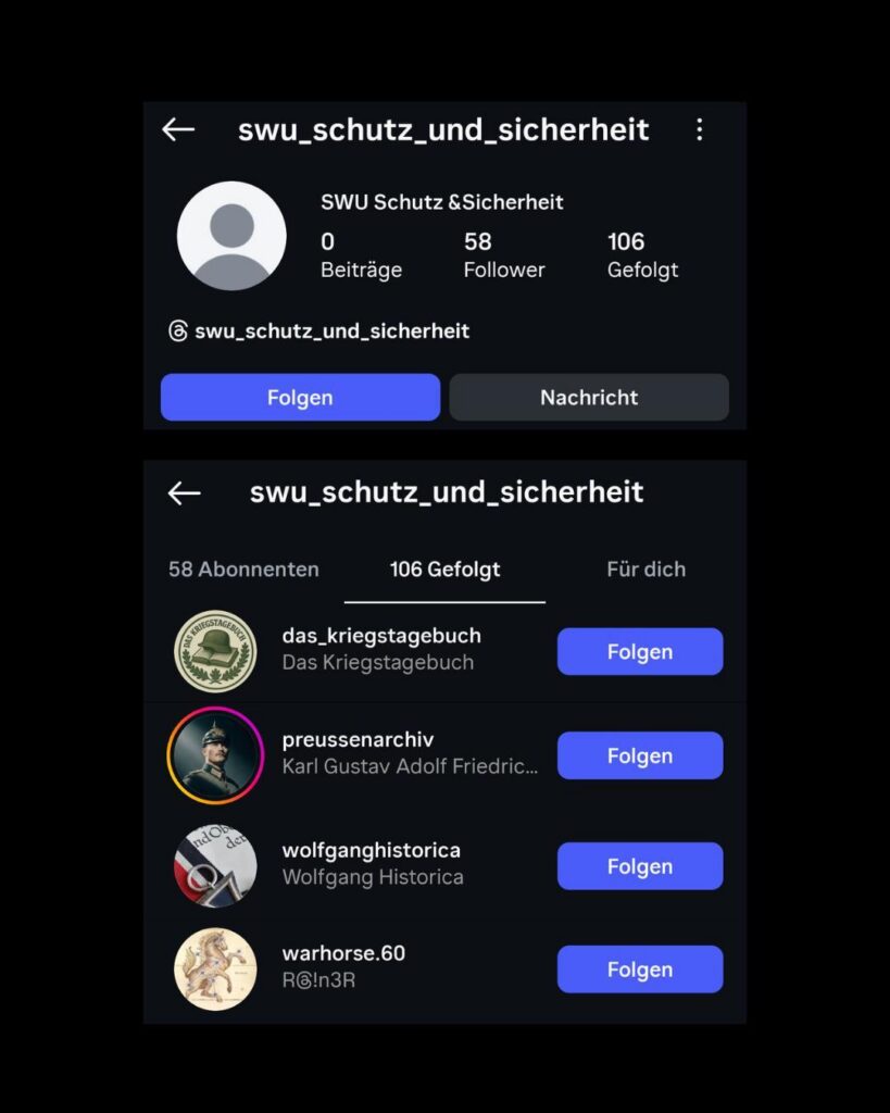 „Neben der Internetseite des Unternehmens gibt es einen Instagram-Account namens swu_schutz_und_sicherheit. Schockiert waren wir nach einem Blick auf die Seiten, welchen der Account folgt. Da sind reihenweise rechtsextreme und kriegsverherrlichende Accounts dabei, die Symbole und Waffen aus dem Nationalsozialismus zeigen und diese glorifizieren.