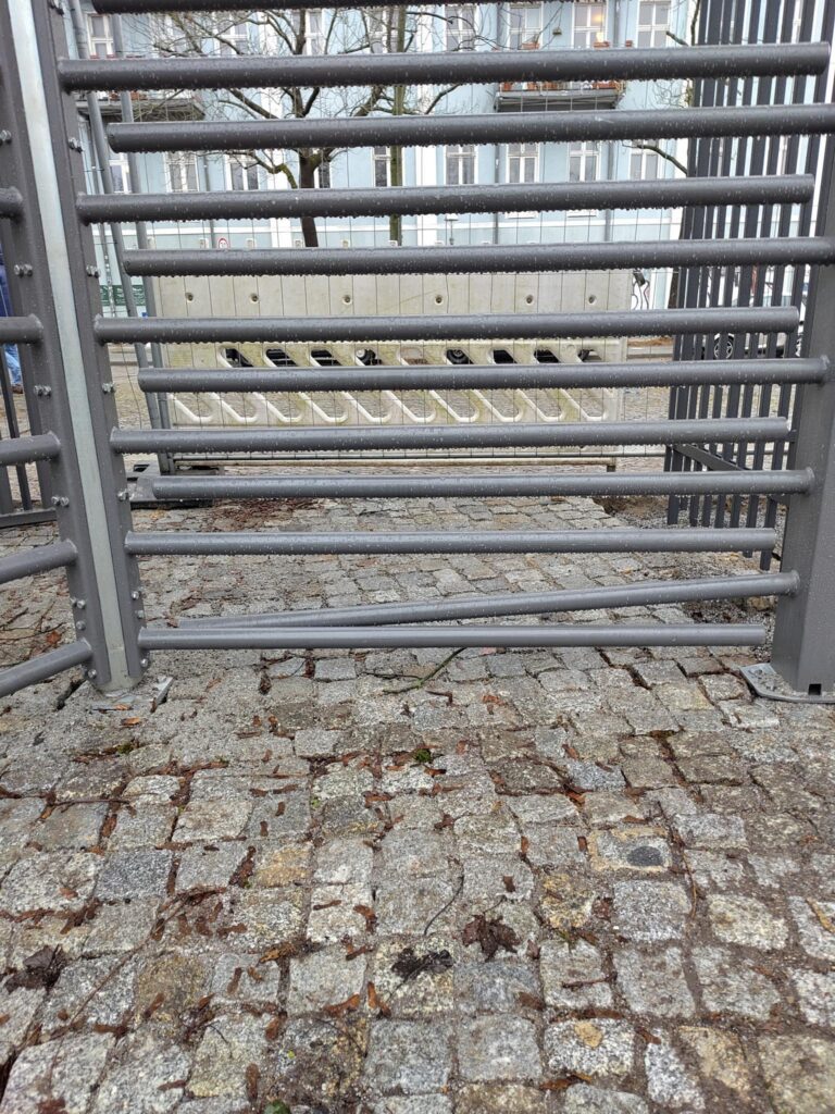 Millionenteure Einsätze von privater Security und unzählige Cops in Uniform und in zivil sind offenbar nicht genug. Heute konnten wieder diverse Beschädigungen an den teuren Görli-Sperranlagen beobachtet werden, darunter u.a. anscheinend zugeklebte Schlösser (die wohl direkt ausgewechselt wurden), ein recht derb außer Form geratenes Drehkreuz und ein nur noch fragil an den Angeln hängenden Tor.